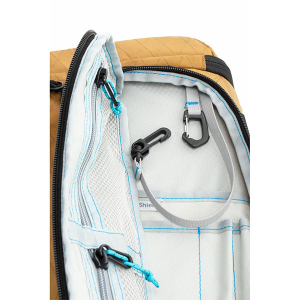 ●右側のポケットにはジッパー付きメッシュポケットのほか、ペンホルダー、オーガナイザーポケット、キーフック、別売の「テンボ 12 メモリーカードウォレット」用ランヤード、さらにパスポートなど貴重品を守るRFIDシールド付きのポケットがあります
