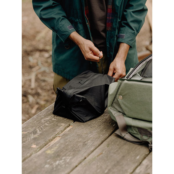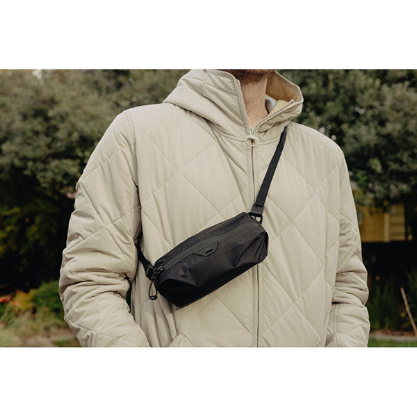 ポーチ上部のコードフックループに別売りのピークデザイン製ストラップやフラットフックストラップ(発売予定)を取り付けるだけで、超軽量なスリングバッグに早変わり。必需品だけをまとめてそのまま持ち出せるので、旅先でのちょっとした外出時に便利です。