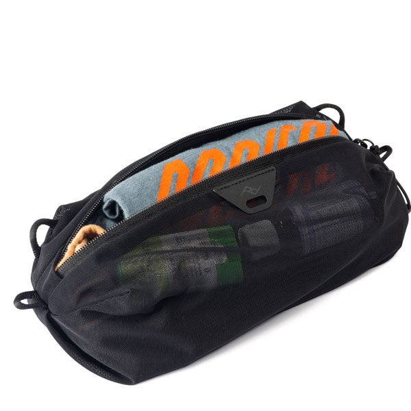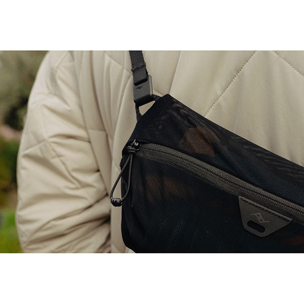 ポーチ上部のコードフックループに別売りのピークデザイン製ストラップやフラットフックストラップ(発売予定)を取り付けるだけで、超軽量なスリングバッグに早変わり。必需品だけをまとめてそのまま持ち出せるので、旅先でのちょっとした外出時に便利です。
