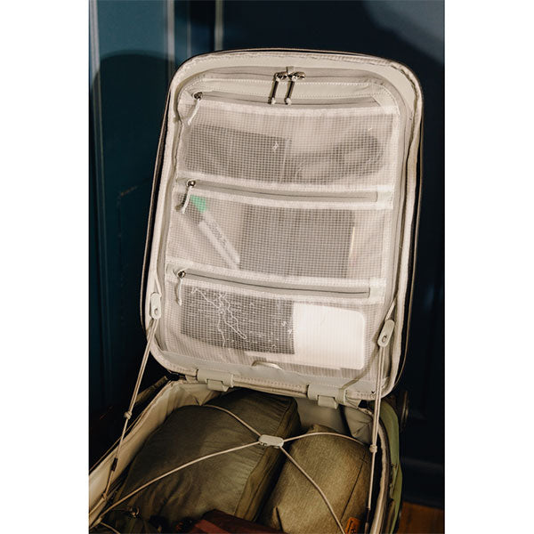 フロントパネル内側には、リップストップナイロンを採用した視認性の良い3つのジッパーポケットを備えています。さらにその裏側にはジャケットやシャツなどを収納できるジッパー付きの収納スペースがあり、紛失防止用のAirTagポケットとパスポートなど貴重品を入れる隠しポケットを備えています。