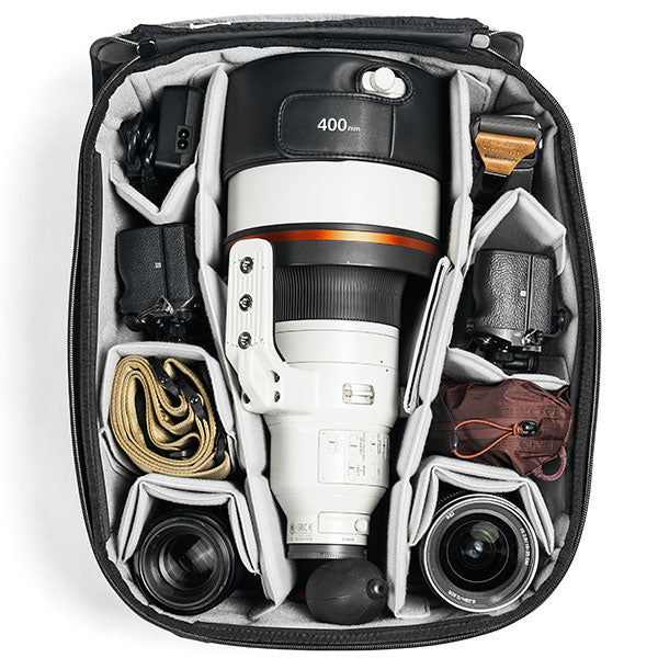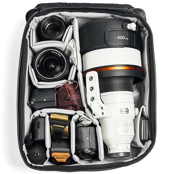機材への高いアクセス性と使い勝手の良さに定評がある「カメラキューブ」シリーズに、超望遠レンズも収納できる最大サイズ「Xラージ」が加わります。フード付きの400mmプライムレンズ本体を収納できるサイズ感です。ローラープロにぴったりと収まり、付属のCクリップを使ってケースのメインコンパートメントに固定できます。