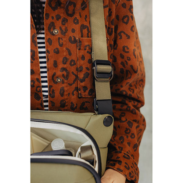 クロスボディストラップの取り付け位置を変更することで、ウエストバッグとしても使用できます。