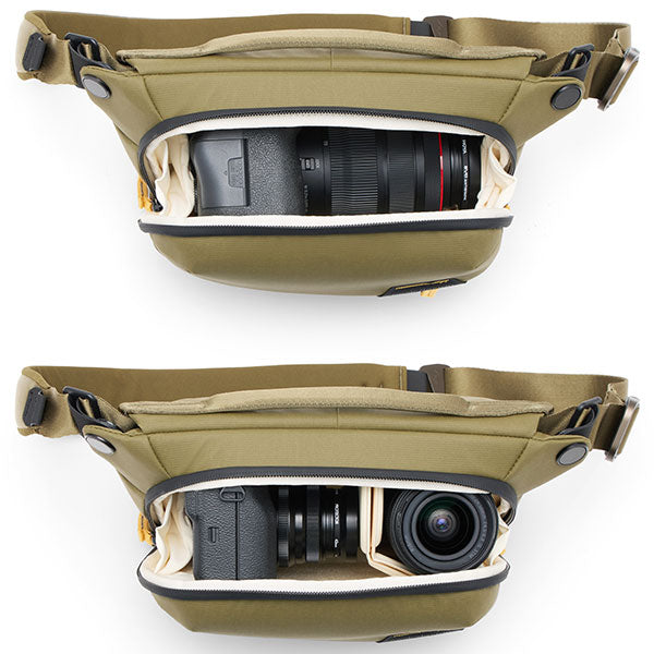 - 小型・軽量で、機動性に優れたスリングバッグ。コンパクトなミラーレスカメラとレンズなどを収納可能。