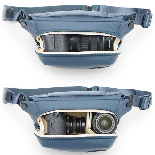 - 小型・軽量で、機動性に優れたスリングバッグ。コンパクトなミラーレスカメラとレンズなどを収納可能。