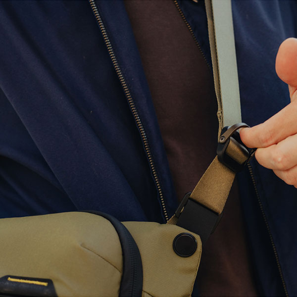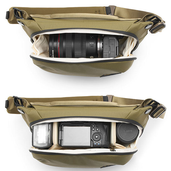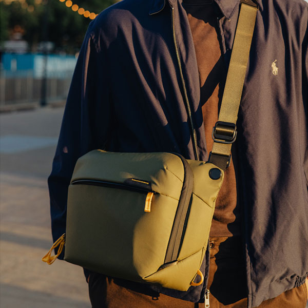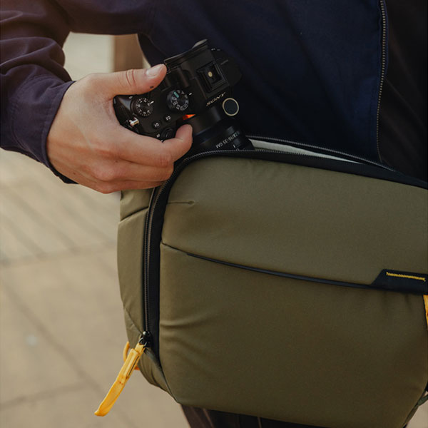 ミラーレスカメラやコンパクトカメラはもちろん、小型一眼レフを1台持ち運べるタウンユースに最適なエブリデイスリング6L。カメラに加えてタブレットや小物を収納できるので、使用の幅が広がります。ウエストバッグとしても使用でき、充実した機能を持つ小型カメラバッグです。また、バッグの表面には、100パーセントリサイクル素材の400Dナイロンキャンバスを採用しています。