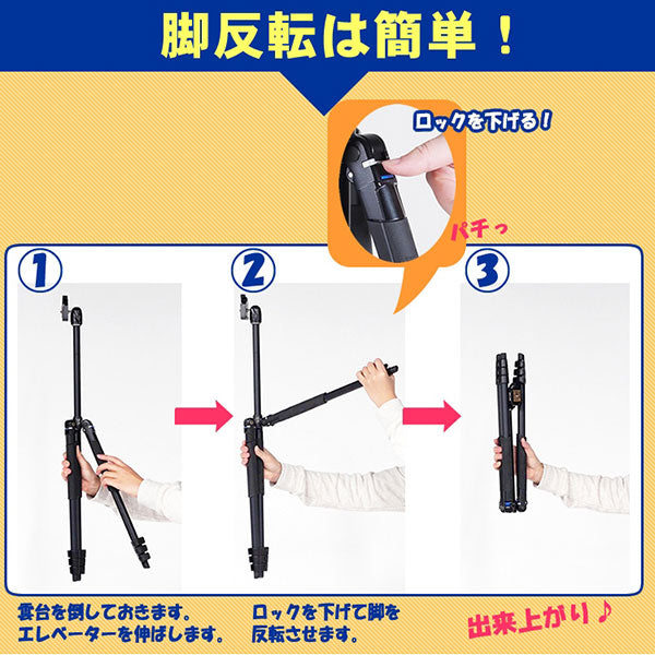 一般的なトラベル三脚ですとボタンを押したまま、脚の根元を持って開脚操作をしなければなりませんでしたが、エアリーシリーズではボタンから手を離しても開脚操作が行えます。