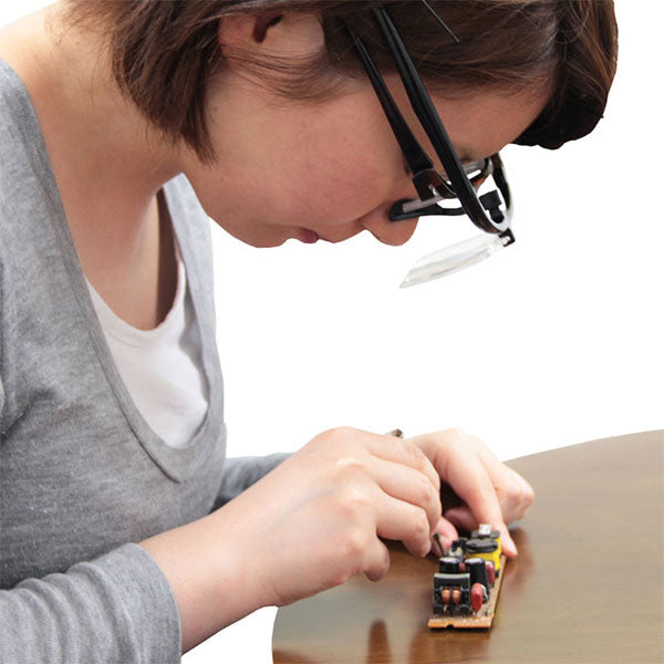 ・メガネのようにかけて使用する両眼観察用ルーペです。手を使わず観察できるので、爪の手入れや読書など日常使いはもちろん、プラモデル作りや刺繍作業など両手を使う細かい作業に大変便利です。