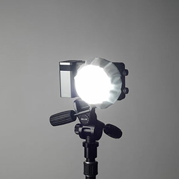 機材への取り付けはディフューザー開口部のゴムを広げてストロボ発光部、リフレクター前面に被せるだけ。簡単にご使用いただけます。