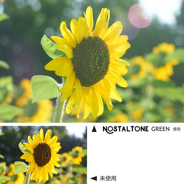 ノスタルトーン・グリーンは弱めのソフト効果ですが、逆光や強めのサイド光、強い光源を入れると、コントラストを抑えつつふんわりと柔らかい光の拡散効果が得られます。
