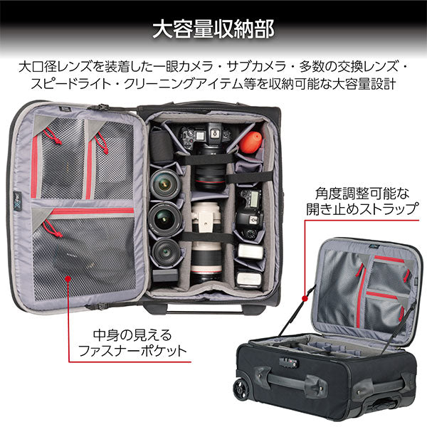 大口径レンズを装着したプロ用一眼カメラと交換レンズ等が入る大容量設計