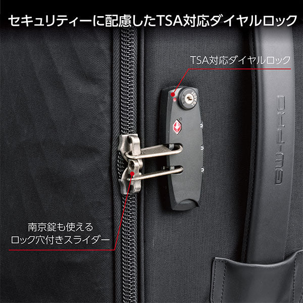 ・スライダーには南京錠などをかけることのできるロック穴付きタイプを使用しています。セキュリティーに配慮したダイヤルロックはTSAロック対応です。