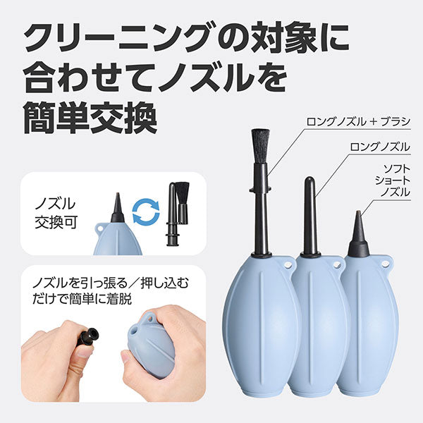 先端までソフトなシリコン素材のショートノズルは、清掃中に機材と接触しても傷をつけにくく、大切なカメラやOA機器にも安心して使用できます