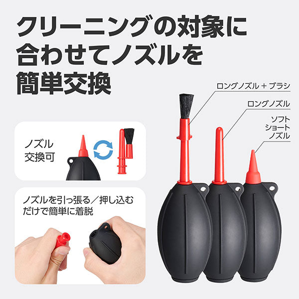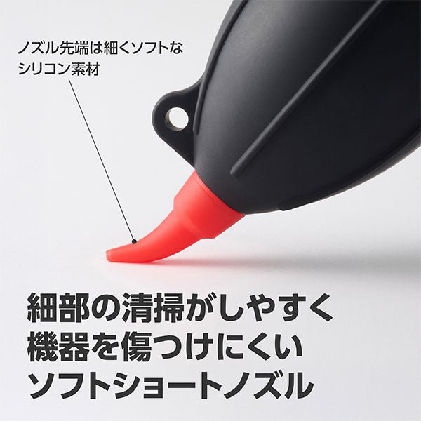 先端までソフトなシリコン素材のショートノズルは、清掃中に機材と接触しても傷をつけにくく、大切なカメラやOA機器にも安心して使用できます