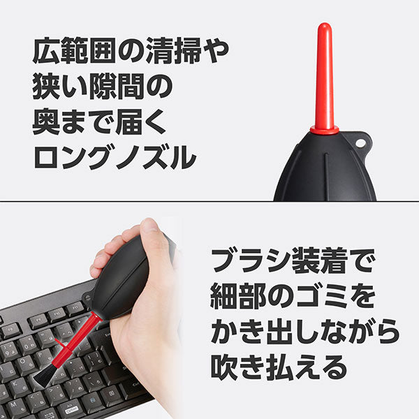ブロアーの先端を細かくコントロールできるので、カメラボディの溝、レンズマウントの接点、PCキーボードの隙間など、細部のホコリやゴミを的確に吹き飛ばします