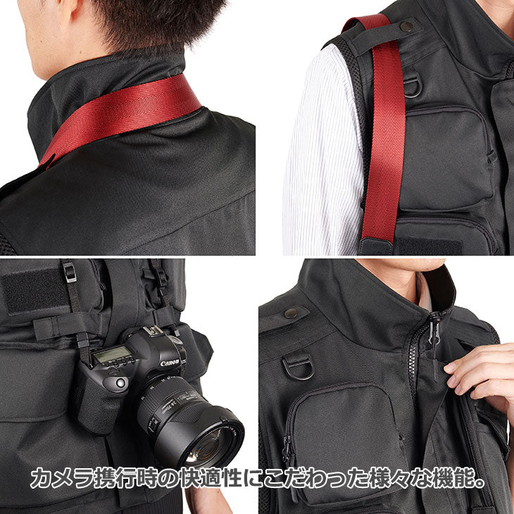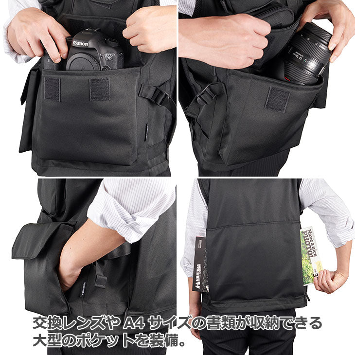 ●撮影時に必要な交換レンズやコンパクトカメラ、フィルター、ストロボ、ミニ三脚、スマートフォン等の小物が入る多数のポケットを装備し、背面の大型ポケットにはA4サイズの書類が入る、収納性に優れたカメラマンベストです。