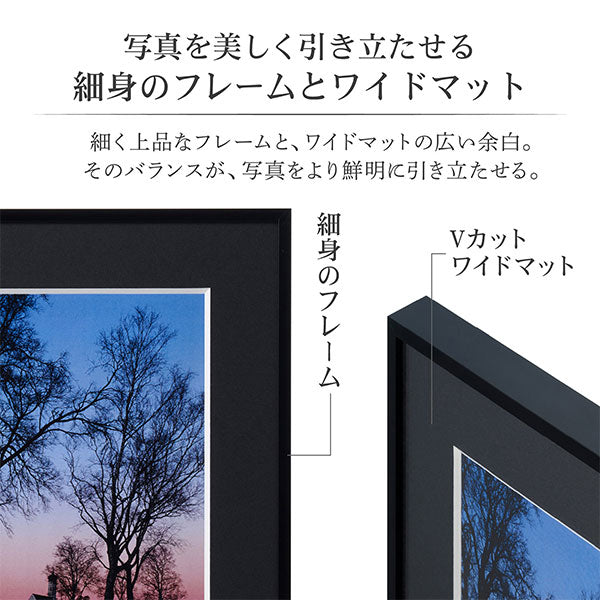 ●細身のフレームとワイドマットが作品を引き立たせる、展示会等に最適なアルミ製額縁です