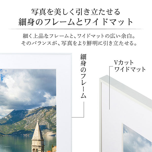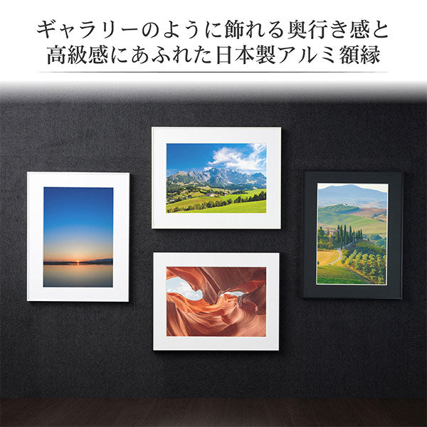 ●細身のフレームとワイドマットが作品を引き立たせる、展示会等に最適なアルミ製額縁です