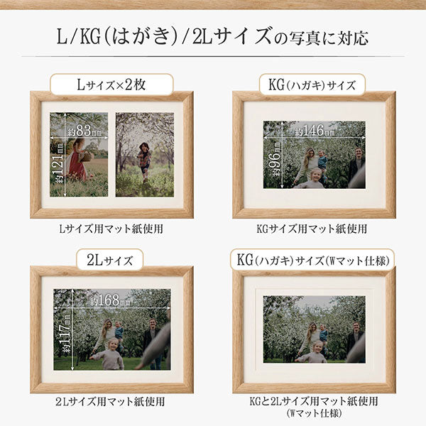 ●付属している3枚のマット紙を入れ替えることで、Lサイズ2枚、KG(ハガキ)サイズ、または2Lサイズの写真の、3パターンの飾り方を楽しめます