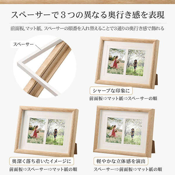 ●前面板やスペーサーの順番を入れ替えることで、3通りの異なる奥行き感を表現できる木製フォトフレーム