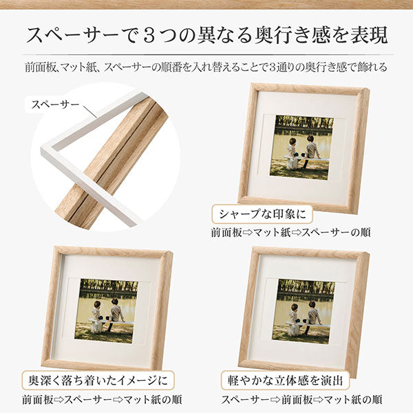 ●前面板やスペーサーの順番を入れ替えることで、3通りの異なる奥行き感を表現できる木製フォトフレーム