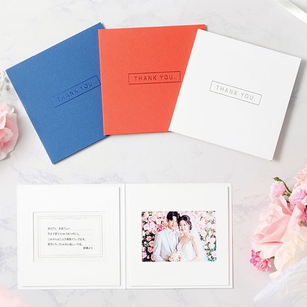 写真とメッセージを入れて、表紙にあしらわれた“THANK YOU”の文字とともに感謝の気持ちをつたえる「フォトメッセージカード」です