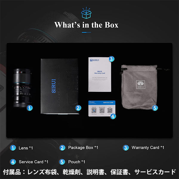 付属品:レンズ布袋、乾燥剤、説明書、保証書、サービスカード