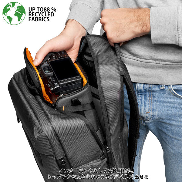 ・収納に便利なフルオープン構造で、インナーバックとしての使用時も、トップアクセスからカメラを素早く機材の取り出しが可能。